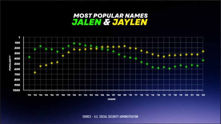 1992年,杰伦-罗斯(Jalen Rose)与“密歇根五虎”在密歇根大学度过首个赛季后,“Jalen”这个名字在美国最受欢迎男孩名字榜单上首次亮相,排名第378位。次年,拼写为“Jaylen”(多了个“y”)的名字首次上榜,位列第668位。从那以后,这两个名字一直位列前1000名。