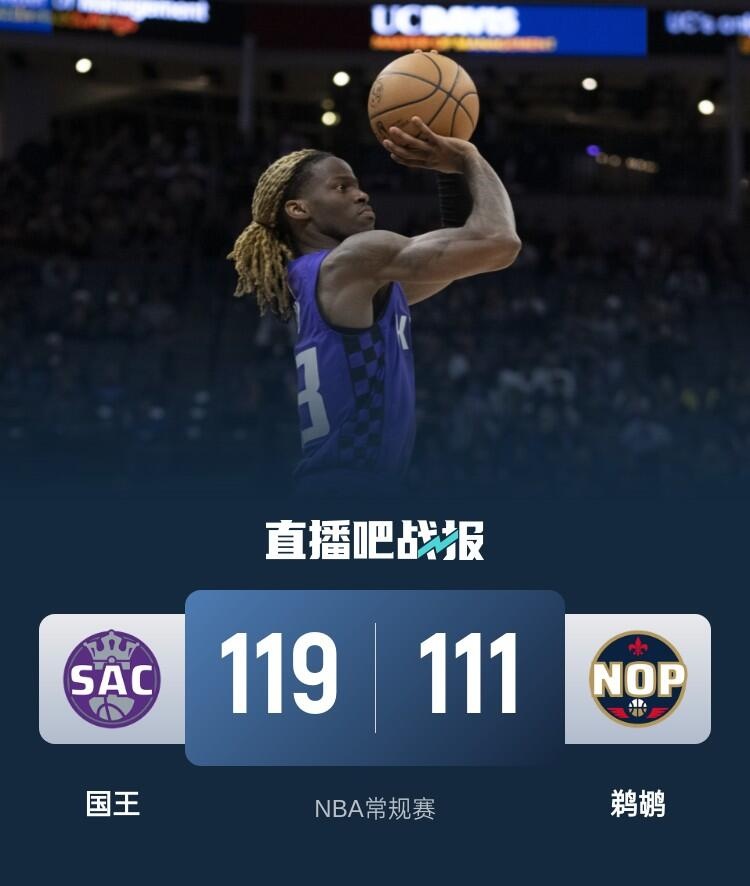 首节开打后双方便陷入缠斗,埃利斯替补登场扮演奇兵,连中三分单节贡献13分,帮助国王中段发力拉开比分,首节结束时国王确立8分优势,次节回来,锡安和阿尔瓦拉多内外结合率队追分,德罗赞连投带罚稳住局势,半场战罢,国王依然领先4分。易边再战后双方比分继续紧咬,中段鹈鹕进攻断电,国王抓住机会轰出12-0攻击波,三节结束后国王保持8分优势,末节决战,鹈鹕进攻乏力追分无望,国王多点开花锁定胜局,最终国王击败鹈鹕送对手10连败。