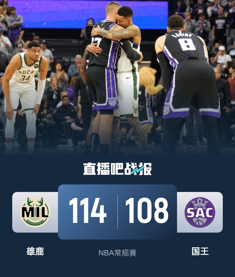 开场后瓦兰在内线打得相当强硬,德罗赞和拉文也轮番拿分帮助国王取得领先,雄鹿进入状态较慢,只靠字母哥一人艰难拿分。第二节上来拉拉维亚状态火热频频拿分,小波特毫不示弱砍分回应,大洛佩斯和埃利斯在外线对飚三分,国王进攻表现出色在半场结束时将分差拉大到两位数。易边再战,字母哥再度进入状态大杀四方,雄鹿在他的带领下也找回节奏一路追平比分,国王两记三分稳住局面。最后一节雄鹿依靠轮换阵容的发挥完成反超,国王外线及时回应三分将比分咬住,字母哥送出传球助特伦特命中关键三分,拉文关键两罚全铁,最终雄鹿114-108逆转击败国王取得2连胜,国王遭遇2连败。