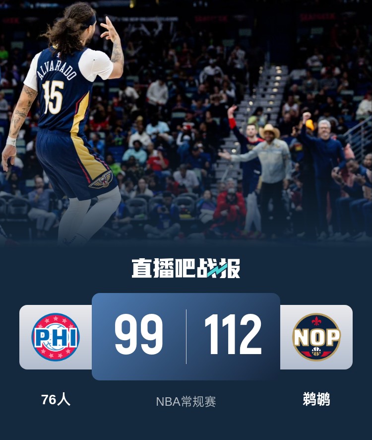 首节之争鹈鹕虽然一整节都保持领先但优势不大一直占不到太大便宜,次节开局鹈鹕依靠着两记三分的一波8-0才拉开10分分差占据上风,76人整个上半场一直不愠不火表现很一般,落后到两位数分差也无力制造威胁反扑并带着9分劣势进入下半场。休息归来76人节中接连命中4记三分一度实现反超,但鹈鹕也很快找到感觉,他们在5分钟的时间里送上19-6的攻势直接反超重新拉开两位数领先,末节将分差拉大至20分以上彻底杀死比赛悬念。最终,鹈鹕主场大胜76人拿下比赛。
