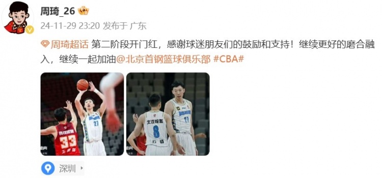 赛后,周琦更博并写道:“第二阶段开门红,感谢球迷朋友们的鼓励和支持!继续更好地磨合融入,继续一起加油。”
