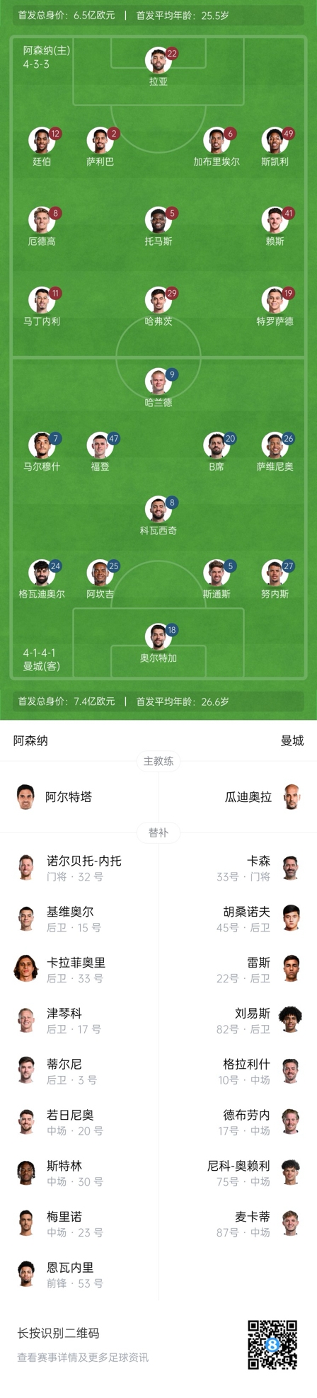 2月2日讯 英超第24轮,阿森纳主场迎战曼城,赛前首发名单公布。