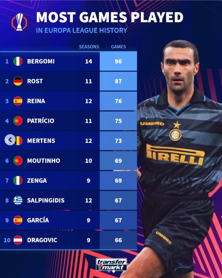 9月25日讯 德转统计了欧联(含前身欧洲联盟杯)球员出场数据,贝尔戈米96场成为出场王,雷纳、曾加位居前十。