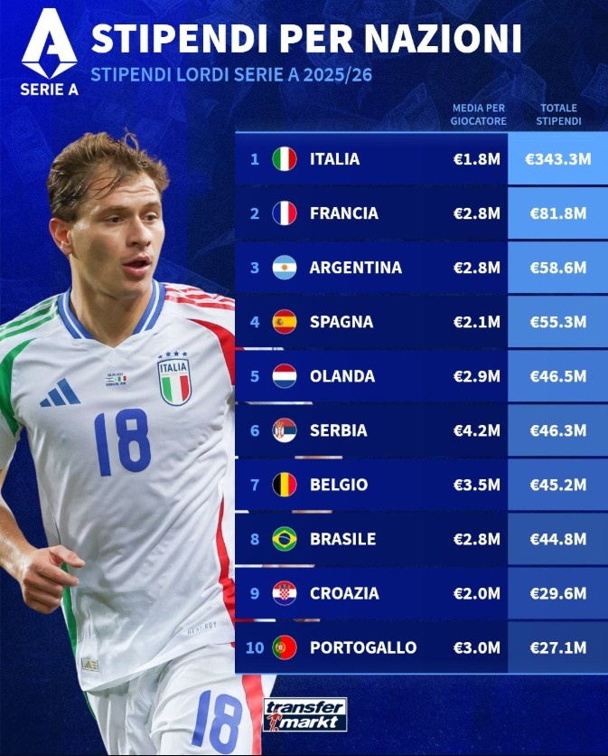 9月26日讯 德国转会市场对意甲球员的薪资情况进行了盘点,意大利球员总薪资最高,而塞尔维亚球员的平均年薪最高。