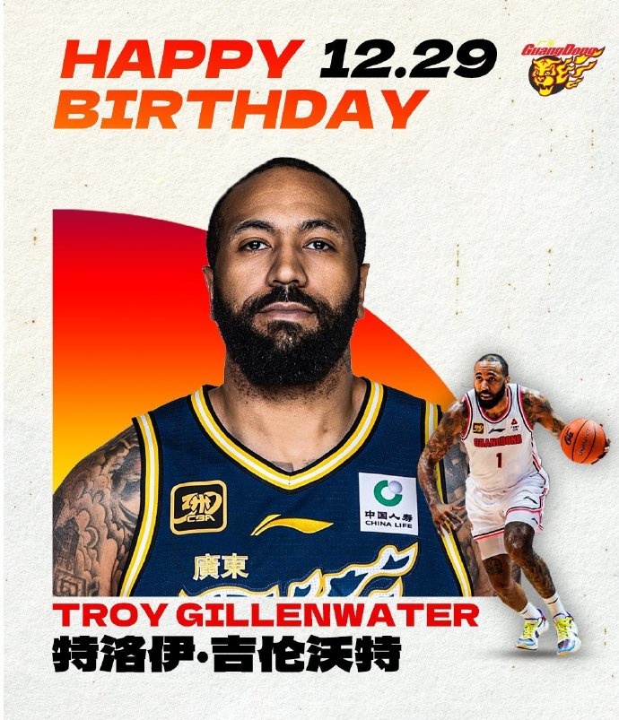 12月29日讯 今天是广东外援吉伦沃特的36岁生日,广东男篮官博送上了生日祝福。