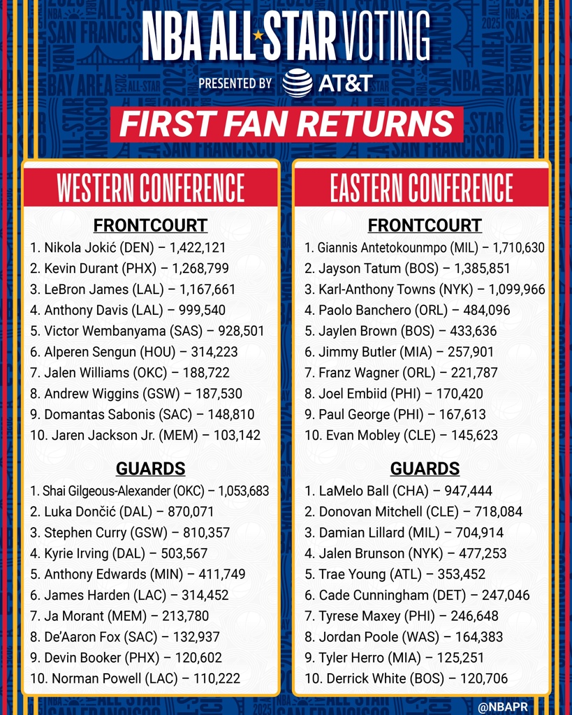 01月03日讯 NBA官方公布了2025年旧金山全明星周末第一阶段球迷投票结果,字母哥当选票王,约基奇领跑西部,杜兰特、詹姆斯分列西部前场二三位,西部后场前三分别是亚历山大、东契奇和库里,东部后场得票最多的是三球。