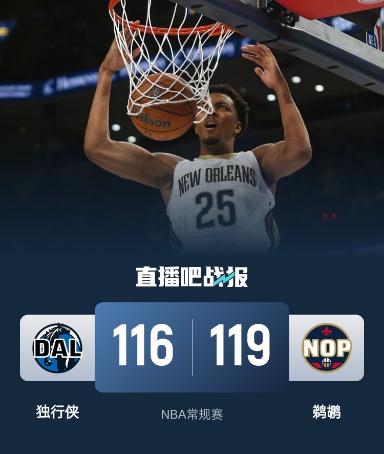 1月16日讯 NBA今日继续开打,鹈鹕今日坐镇主场迎战独行侠。独行侠近期状态持续走低,过去9场比赛仅取得2胜7负的战绩;鹈鹕方面过去状态有所回暖则取得4胜3负,本场比赛锡安缺席比赛。