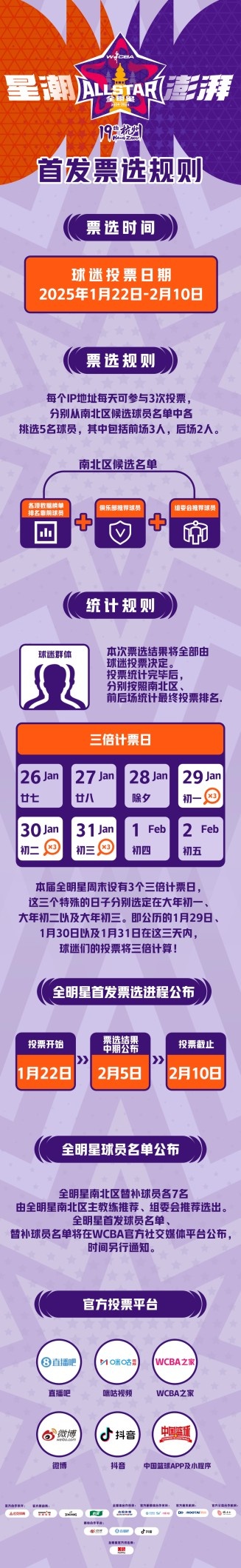 本次全明星赛以“星潮澎湃”为主题,届时,全明星正赛、星锐赛、三分球大赛和技巧挑战赛将在坐落于杭州市中心的黄龙体育中心展开厮杀。