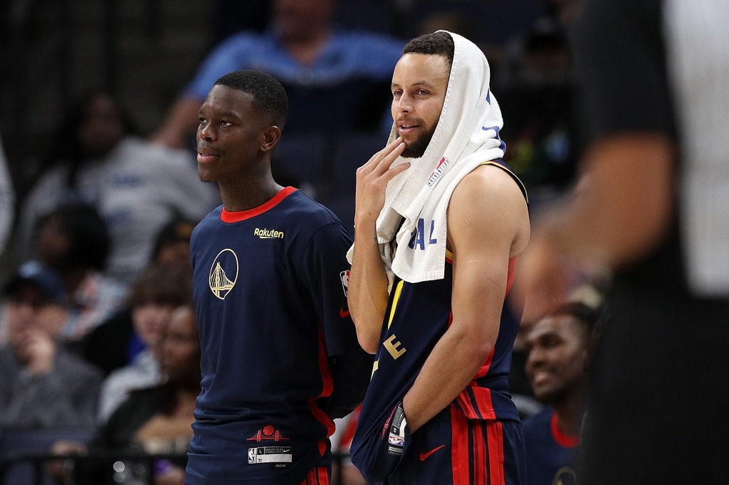 勇士本场比赛首发阵容为:库里、施罗德、维金斯、佩顿二世、TJD。