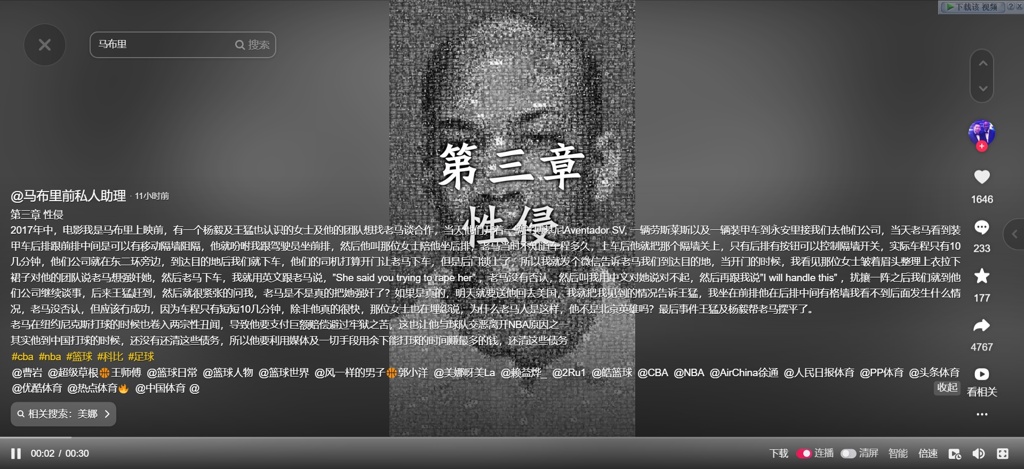 昨晚,该账号爆料马布里在2017年涉嫌性侵,详情如下(下文的斜体字内容为原文):“2017年中,电影我是马布里上映前,有一个杨毅及王猛也认识的女士及他的团队想找老马谈合作,当天他们开着一辆兰博基尼Aventador Sv,一辆劳斯莱斯以及一辆装甲车到永安里接我们去他们公司。