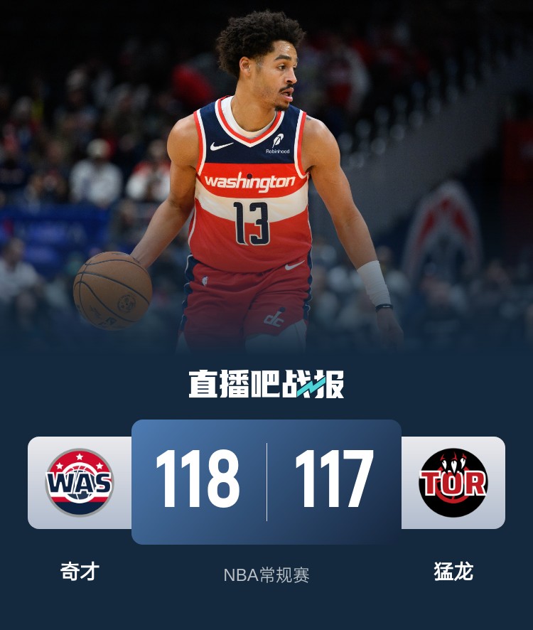 开场后你来我往连续打成平手,巴雷特和巴恩斯连续冲击内线制造杀伤帮助猛龙取得领先。第二节猛龙先声夺人将分差拉大到10分,随后奇才连续打出反击将比分追上,普尔渐入佳境不断拿分,斯玛特替补登场后多次制造罚球,并且用两罚帮助奇才反超比分,普尔半场结束前还投进一记飘移三分。下半场奇才率先发力打出一波10-0将领先优势扩大,此后虽然猛龙进攻找回节奏,但他们防守端被奇才冲爆内线。最后一节猛龙依旧紧追不舍,普尔得分组织一手抓帮助奇才守住领先,但猛龙依靠强打内线还是逐渐追上比分,谢德上篮打进绝杀,但最终超时扣掉,最终奇才118-117终结猛龙3连胜。