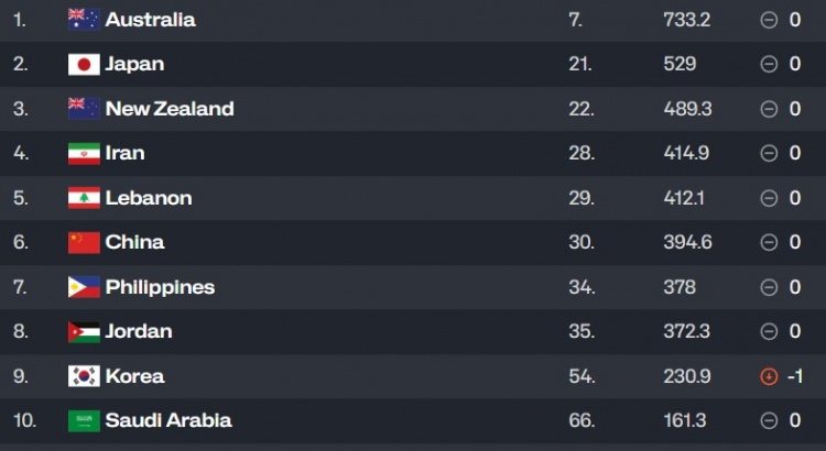 其中,前十名没有变化。中国男篮排名世界第30位,亚洲第6位。
