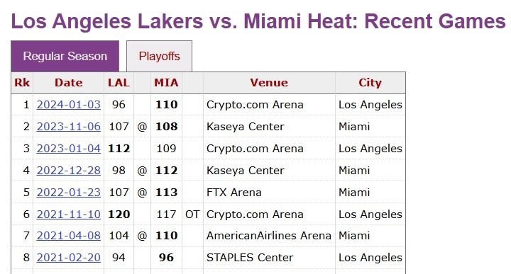 据统计,自从2020年10月12日夺冠后,湖人在接下来4个赛季与热火共交手8次,仅取得2胜6负。