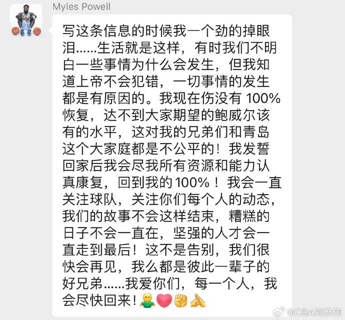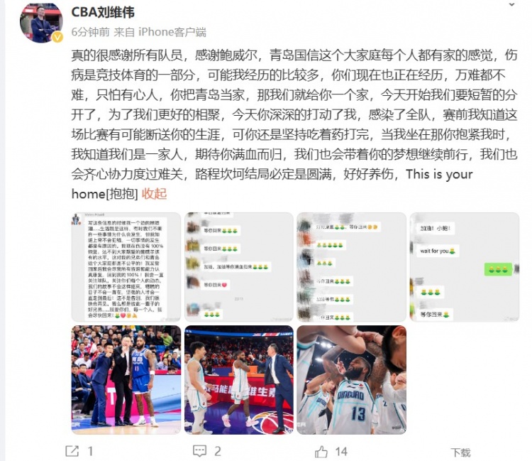 刘维伟更博:“真的很感谢所有队员,感谢鲍威尔,青岛国信这个大家庭每个人都有家的感觉,伤病是竞技体育的一部分,可能我经历的比较多,你们现在也正在经历,万难都不难,只怕有心人,你把青岛当家,那我们就给你一个家,今天开始我们要短暂的分开了,为了我们更好的相聚,今天你深深的打动了我,感染了全队,赛前我知道这场比赛有可能断送你的生涯,可你还是坚持吃着药打完,当我坐在那你抱紧我时,我知道我们是一家人,期待你满血而归,我们也会带着你的梦想继续前行,我们也会齐心协力度过难关,路程坎坷结局必定是圆满,好好养伤,This is your home。”