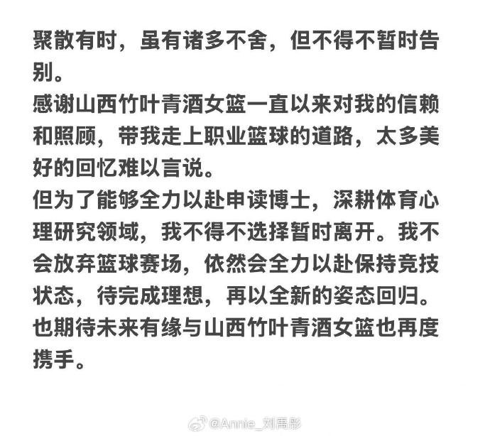 刘禹彤更博配文:“暂时的离别,为了更好的相遇。感谢山西女篮。”