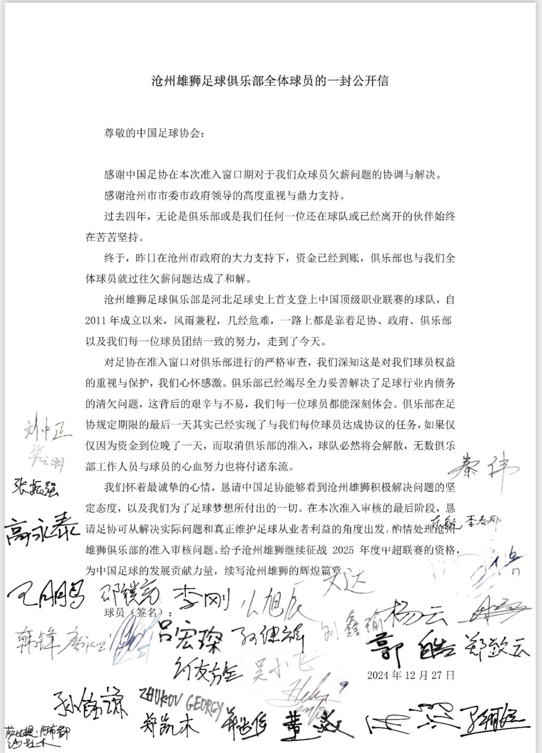 12月28日讯 沧州雄狮全体球员签名公开信,就过往欠薪达和解,恳请足协酌情审核准入,如果仅仅因为资金到位晚一天而取消俱乐部准入,球队必然会解散,无数工作人员与球员的心血努力也将付诸东流。