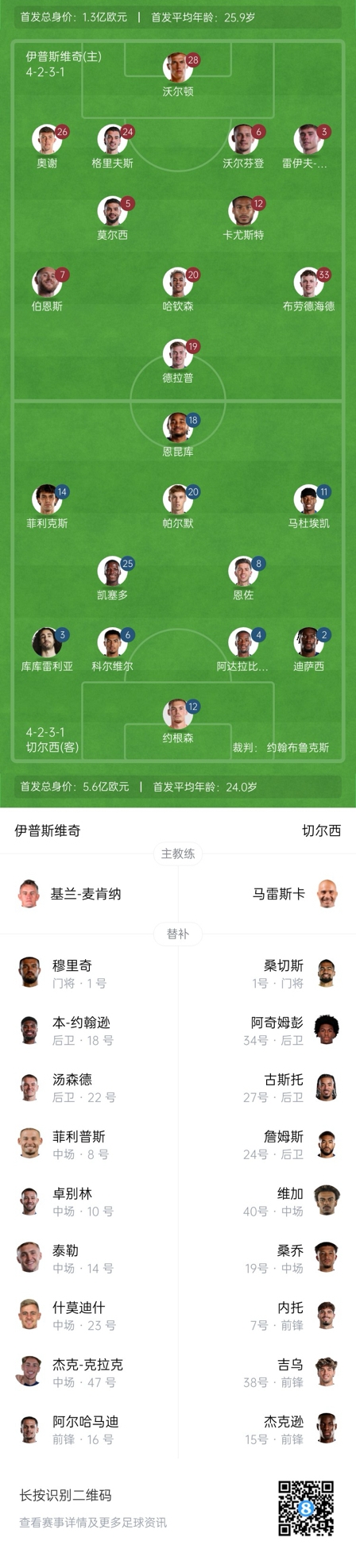 切尔西首发:12-约根森、2-迪萨西、4-阿达拉比奥尤、6-科尔维尔、3-库库雷利亚、25-凯塞多、8-恩佐-费尔南德斯、11-马杜埃凯、20-帕尔默、14-菲利克斯、18-恩昆库