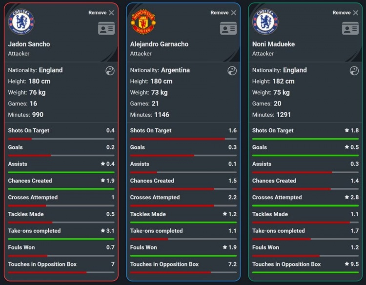 桑乔(曼联外租切尔西,16场):场均0.4次射正、打进0.2球,助攻0.4次、创造机会1.9次、尝试传中1次,抢断0.5次、成功过人3.1次,造犯规0.7次、对方禁区内触球7次