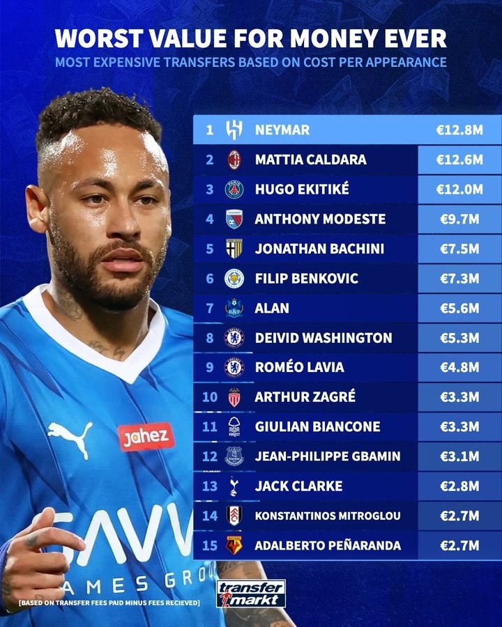 1月29日讯 德转列出球员场均出场花费排行,内马尔场均花费1280万欧居首,埃基蒂克、拉维亚榜上有名。