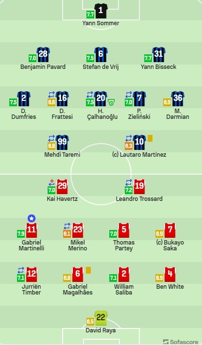 国米专门在中路上了身体,靠自己的对抗来卡住阿森纳不算强壮的前场盘带。本场他们给出了18次铲球、8次拦截、53次解围的数据,多次跟对方碰身体,搞得大家有点恍惚:这到底谁是英格兰的俱乐部啊?