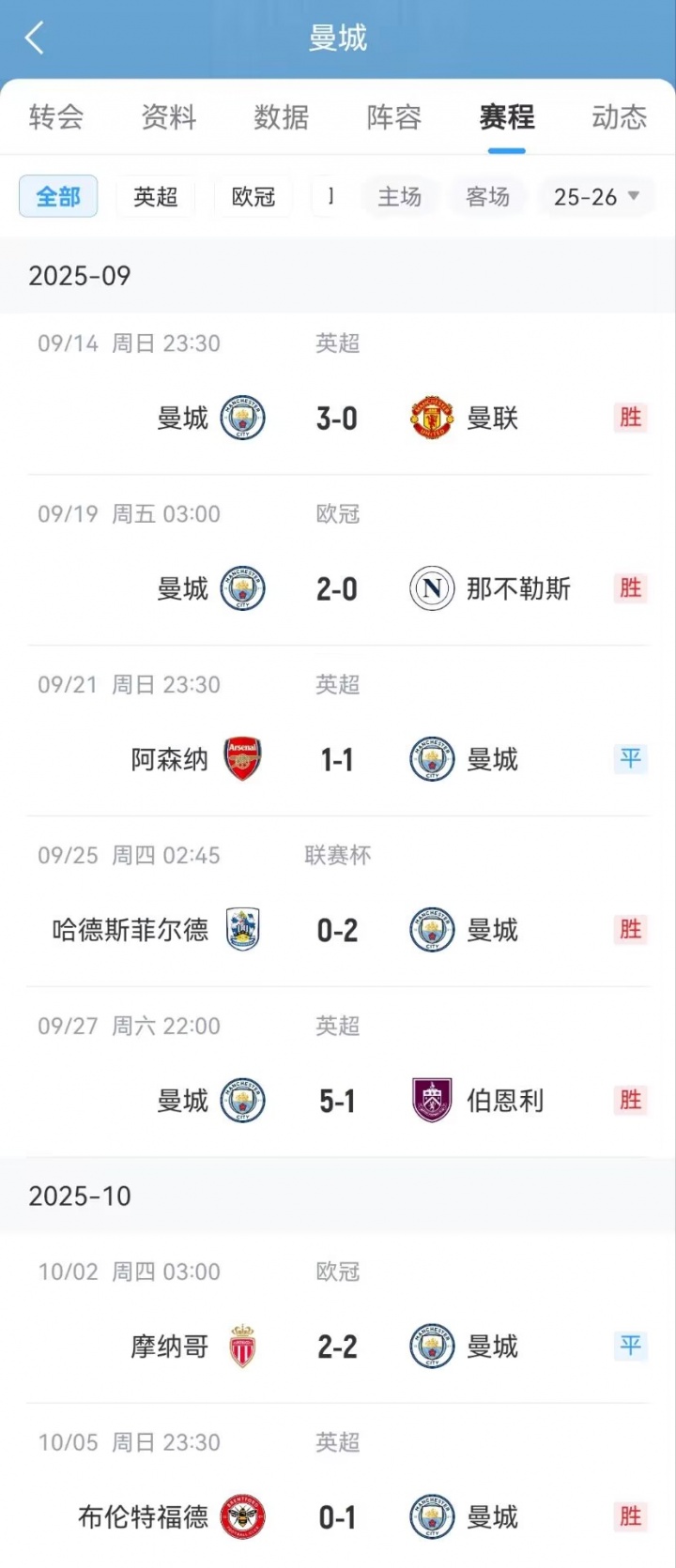 10月08日讯 英超第7轮,曼城1-0客胜布伦特福德。至此,曼城各项赛事已经收获连续7场不败。